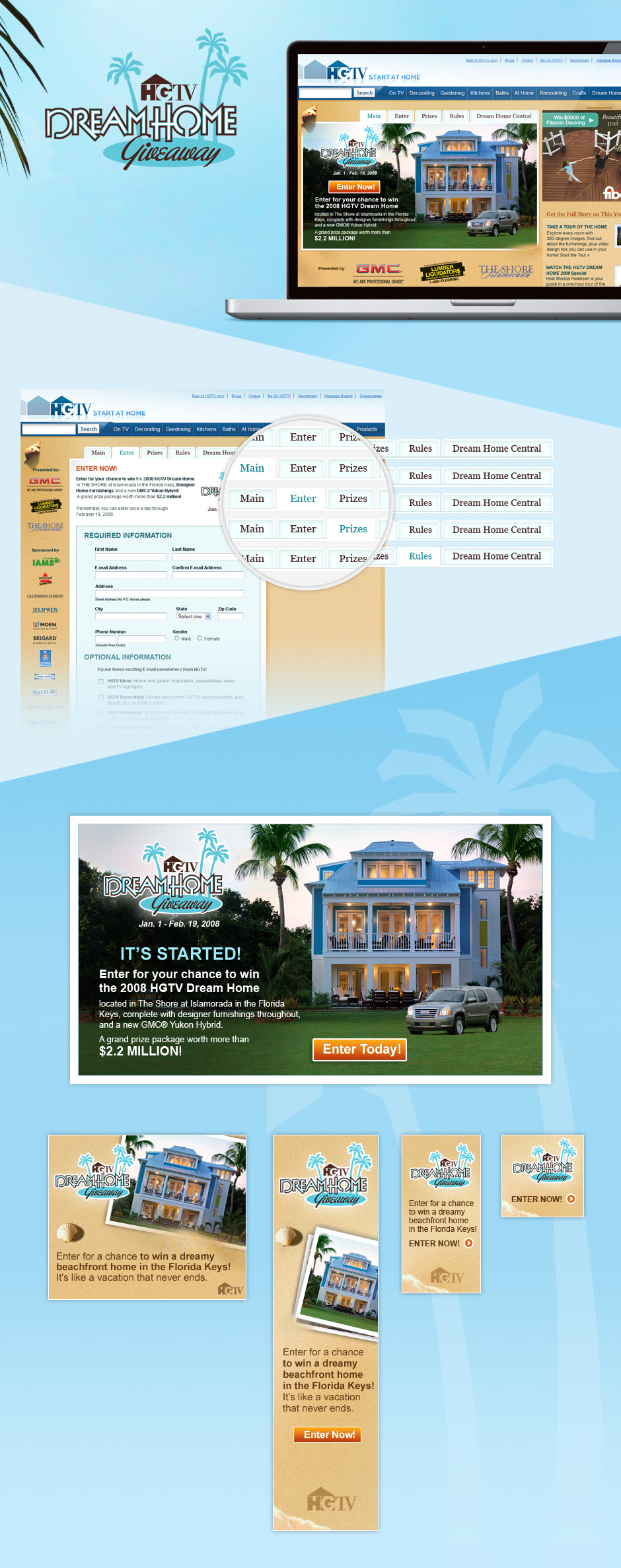 This is one part of the online campaign for HGTV’s DreamHone Giveaway. HGTV came to us for help concepting, designing and developing the DreamHome Giveaway sweepstakes page; and for the creation of supporting images such as email blast graphics and online ad units. We were given free license during the concept and design phase. This one was a lot of fun!