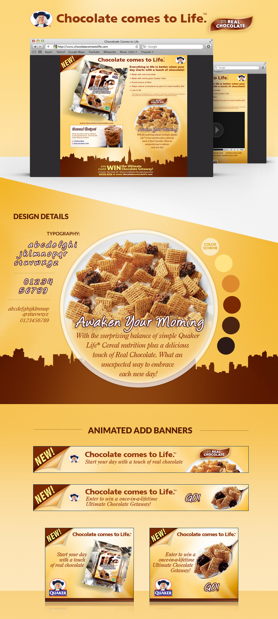 Designed and coded the Quaker Chocolate Life Cereal Microsite. We also created and animated the ad units.